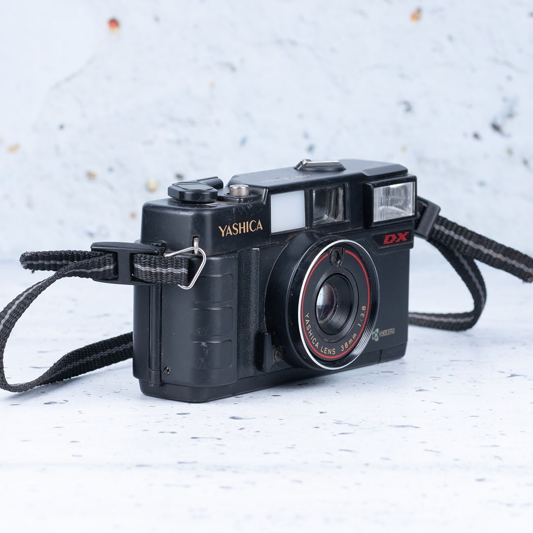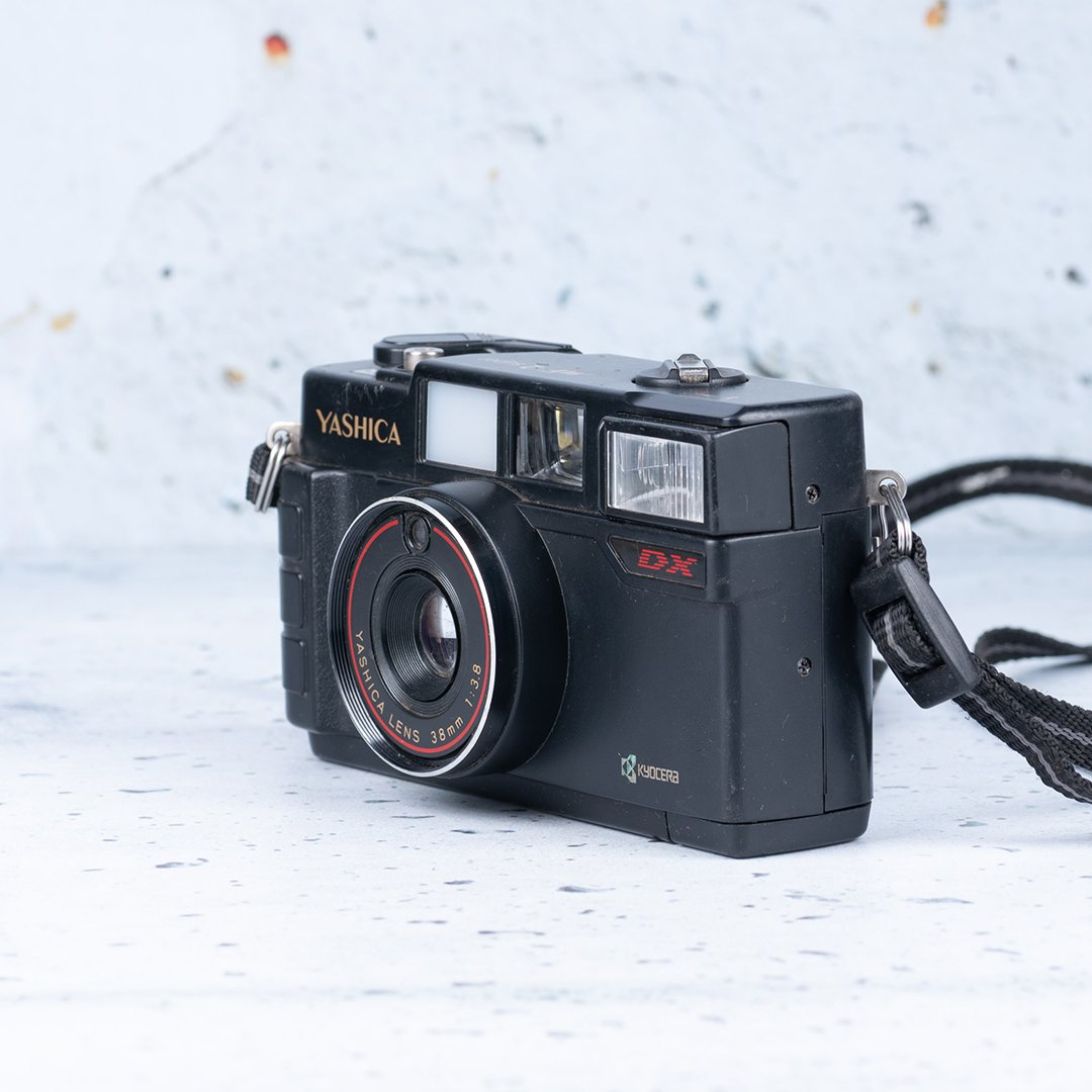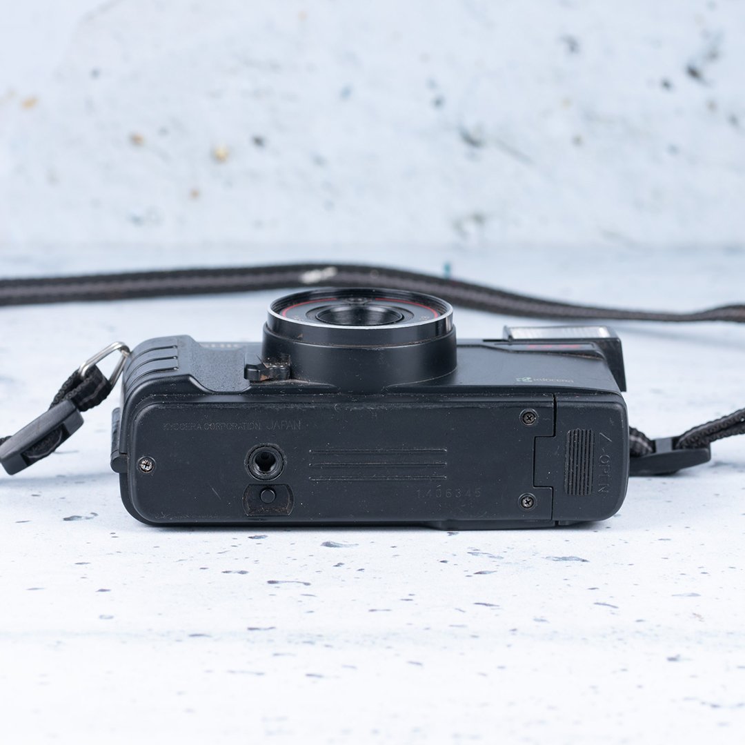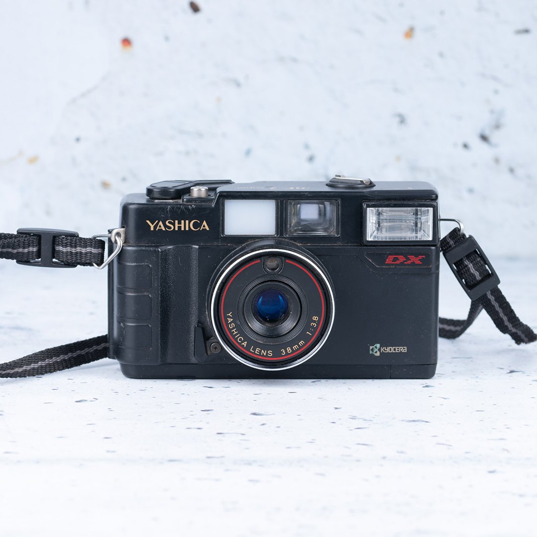 The Yashica DX Kyocera 35mm is a compact point-and-shoot film camera from the late 1980s–1990s. It features a fixed 35mm lens, autofocus, built-in flash, and fully automatic film advance and rewind, making it easy to use for everyday photography. Lightweight and reliable, it’s a simple yet stylish vintage camera ideal for casual shooters and collectors.
